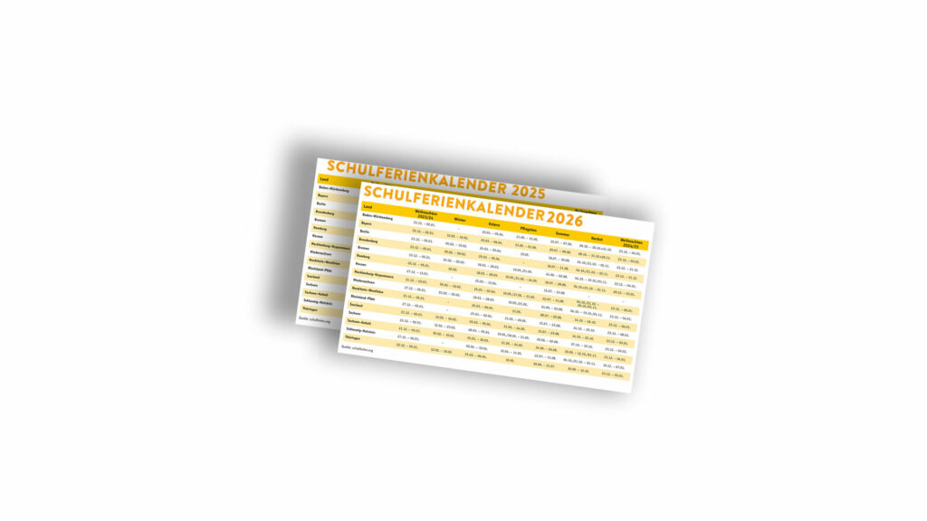 Ihr möchtet eine einfache und schnelle Übersicht über die Schulferien in eurem Bundesland? Dann könnt ihr euch hier gratis unseren Ferienkalender für die Schuljahre 2025 und 2026 herunterladen.
